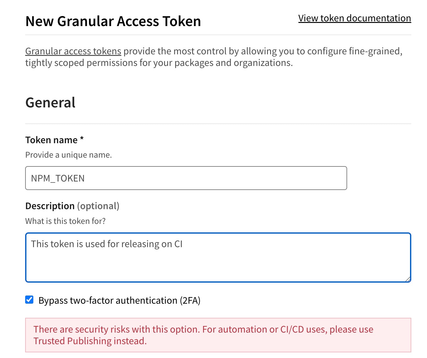 https://www.npmjs.com/settings/{USER}/tokens and create a new granular tokennpm token create command (documentation available in the npm CLI docs)For CI/CD workflows, make sure to: